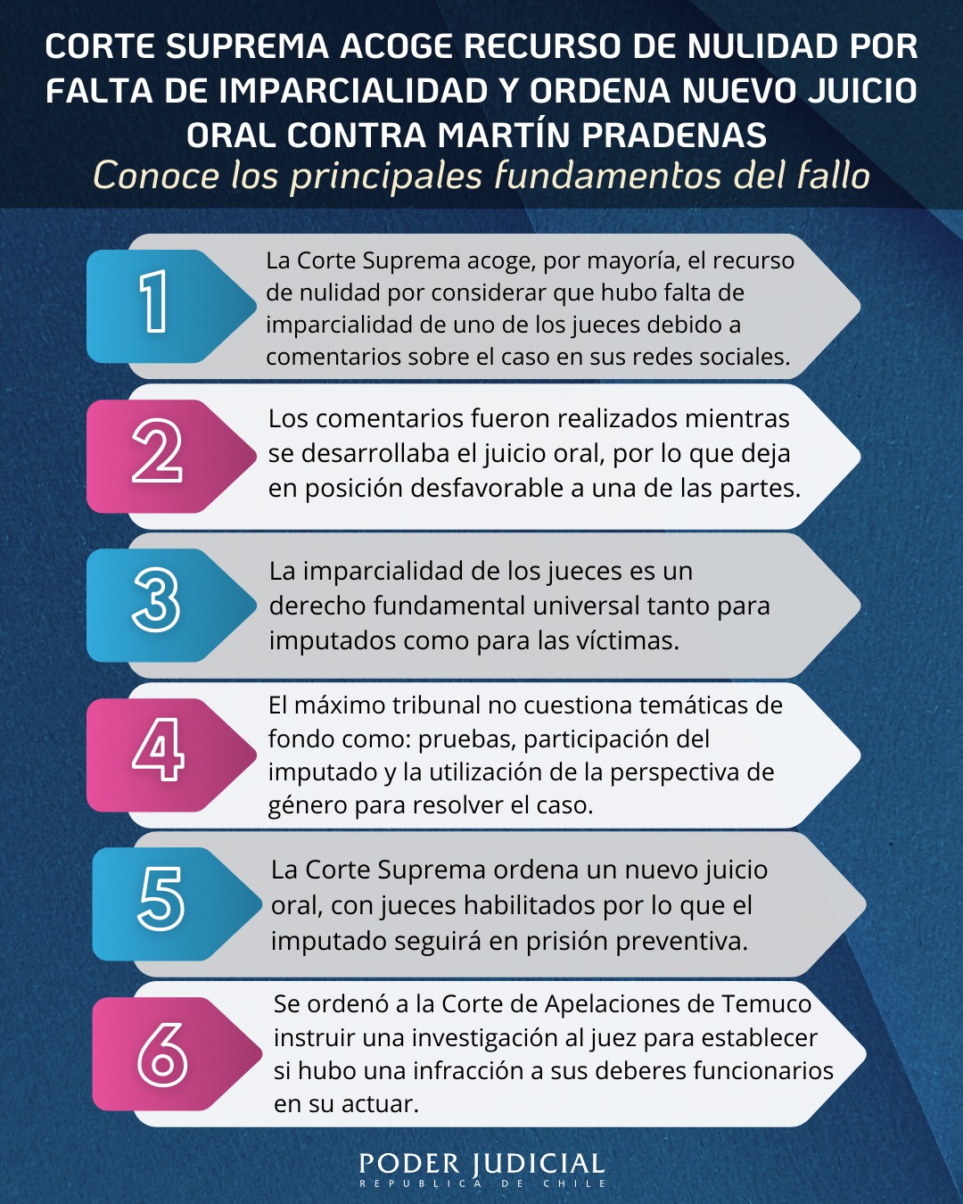 La razón para ello fue explicada en un comunicado del Poder Judicial. “Tras constatar la falta de imparcialidad de uno de los jueces, la Corte Suprema acogió el recurso de nulidad de la defensa y le ordenó al Tribunal de Juicio Oral en lo Penal de Temuco la realización de nuevo juicio, por jueces no inhabilitados”, señala el escrito.