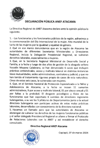 La directiva regional de Anef Atacama presentó una declaración pública expresando su desazón ante el incremento de situaciones de vulneración de derechos y maltratos en diferentes reparticiones públicas, denostando al trabajador fiscal y horadando el servicio público. Son muchos los casos que han sido denunciados desde el maltrato laboral, el abuso de poder hasta el abuso sexual.