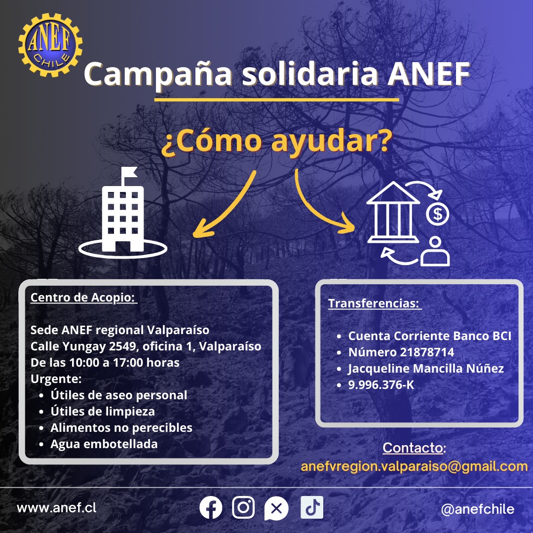 El Consejo Regional hizo un llamado a través de elajitador.cl y de las distintas plataformas de Anef Chile a colaborar con insumos de primera necesidad como son Útiles de higiene personal y Aseo familiar; Pañales para adultos y niños; Alimentos para mascotas; Herramientas como son palas, picotas y carretillas, entre otros, pero se indica no llevar ropa de colaboración. Además del aporte en dinero que se pueda realizar en la Cuenta Corriente Banco BCI, N° 21878714, a nombre de Jacqueline Mancilla Núñez, rut: 9.996.376-K, correo electrónico anefvregion.valparaiso@gmail.com.