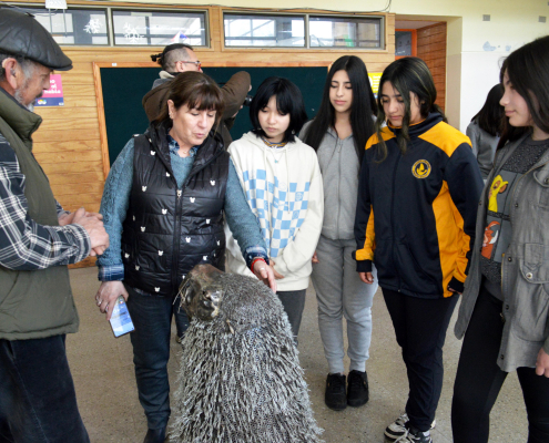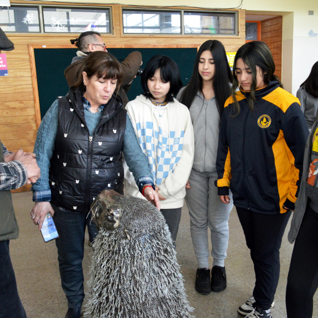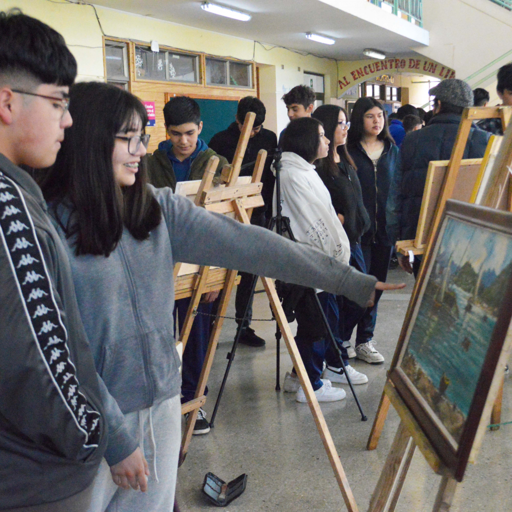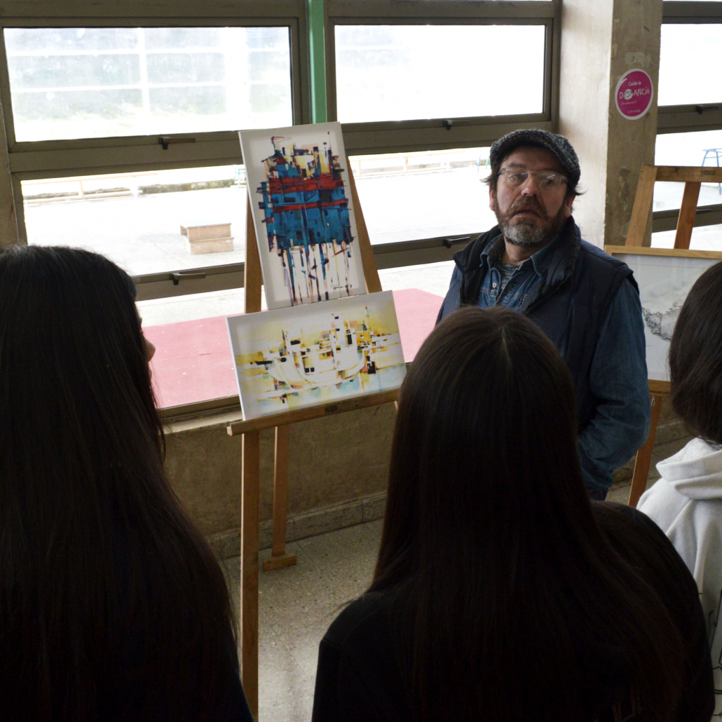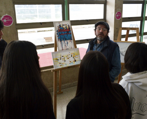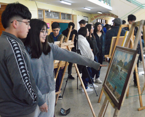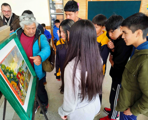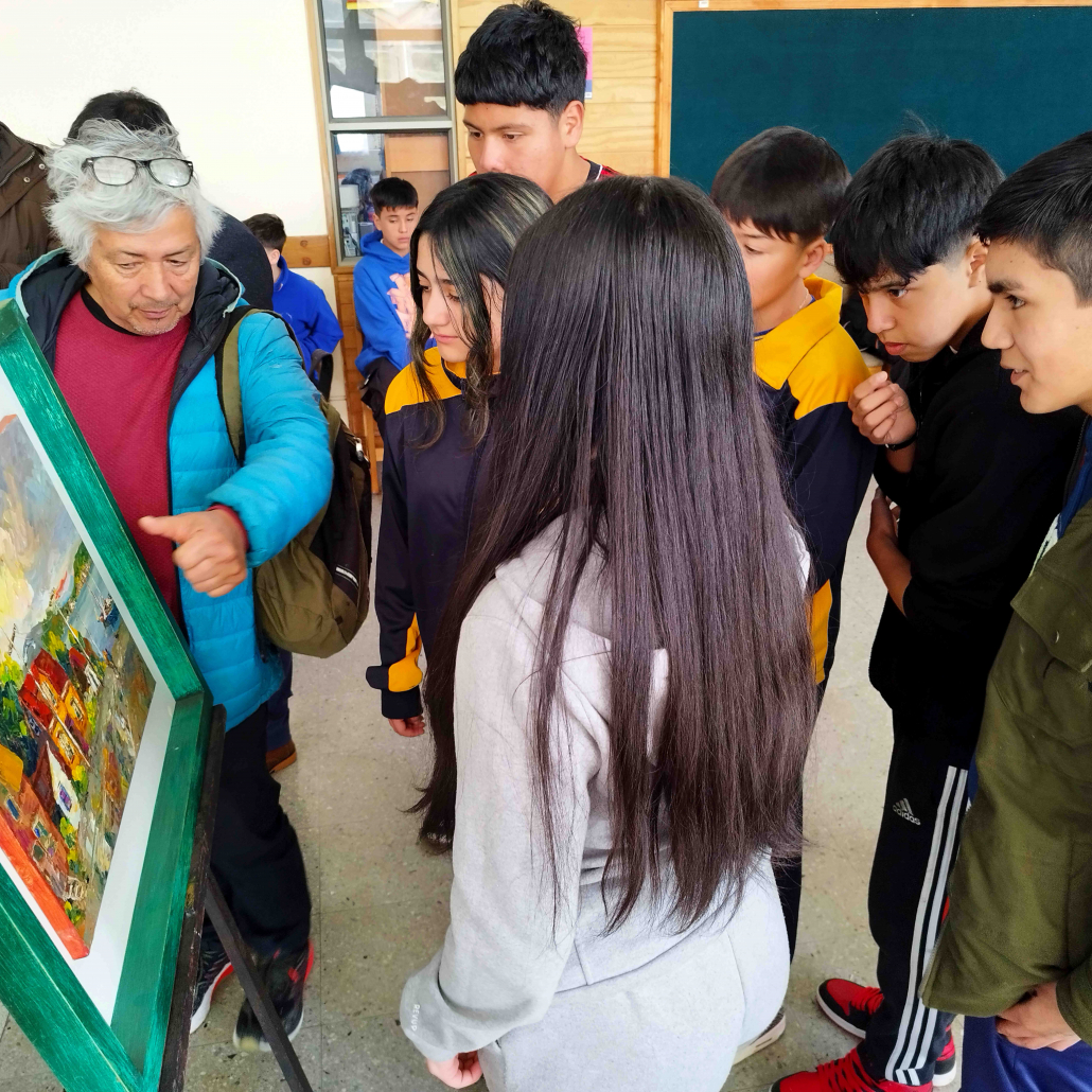 Así explica la gestora de la actividad, profesora de Historia y Artes, Nicol Gallardo, al indicar la importancia que los artistas visiten la escuela con obras que hablan del patrimonio regional. “Junto al taller de Artes trabajamos un proyecto que tiene que ver con la identidad y el patrimonio que habitamos. Desde ahí se gesta una exposición denominada “Territorios”, donde nos vinculamos con el museo y galería de Arte Basg Marine y la cooperativa de artistas Rutarte Sur de la región de Los Lagos. Con ellos logramos hacer una mediación donde las y los estudiantes puedan conocer a los artistas locales, conocer su oficio, sus métodos de trabajo y que se geste un acercamiento entre el artista y los estudiantes. Con esto logramos hacer una exposición relacionada con el maritorio, relacionada con el territorio y su identidad. Además es importantísimo que los artistas lleguen a la escuela porque las y los estudiantes preguntan, conocen y pueden apreciar las obras en vivo y en directo. No es lo mismo que puedan ver obras por un video o en revistas. Acá vieron cómo trabaja un pintor, tocaron la materialidad de una pintura, apreciaron una escultura en metal. Esos detalles amplían el conocimiento de los estudiantes”, finalizó la docente.