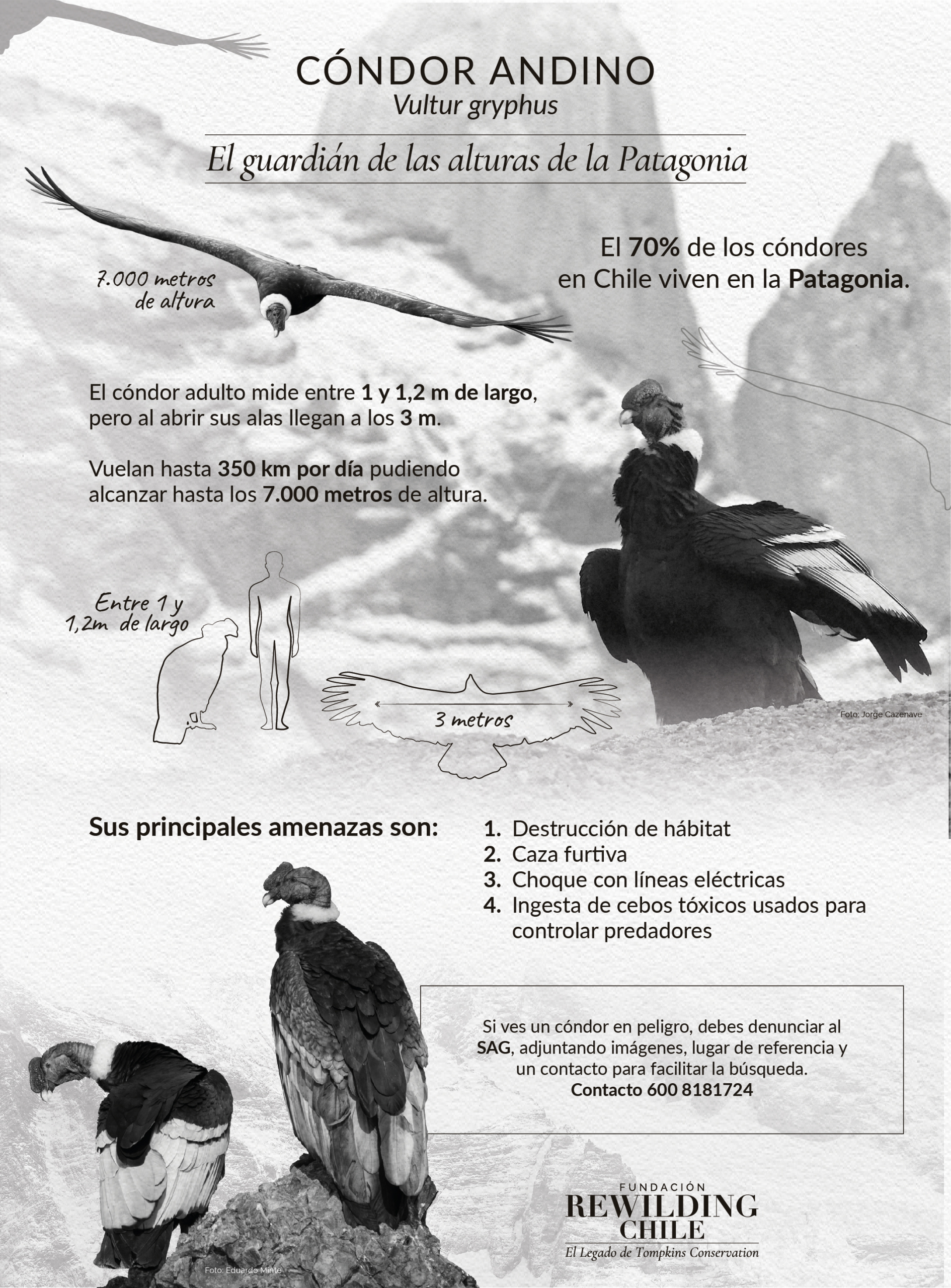 El cóndor es una de las aves voladoras más grandes del mundo y especie emblemática de Chile y las culturas andinas. Hoy, estos animales se encuentran amenazados por la acción humana. La caza, la ingesta de tóxicos, la colisión con tendidos eléctricos y la disminución de sus fuentes de alimento. Estos son algunos de los factores que han producido una considerable disminución de sus poblaciones.
