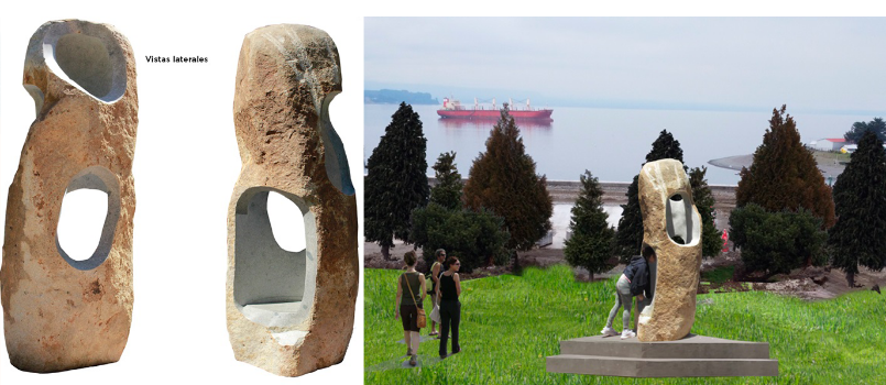 La primera de las obras concursantes busca representar a los chilotes como una “raza de navegantes”. La estructura de piedra tallada es hueca, de forma que “la luz construya el interior”.
