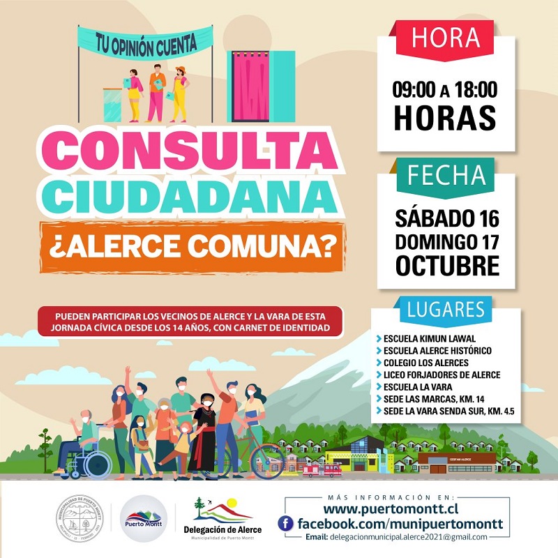 En una consulta abierta a ciudadanos a partir de los 14 años se recogerá la opinión de los habitantes acerca de transformar la localidad de Alerce en comuna. Las votaciones se realizarán entre las 9 y 18 hrs. en 44 mesas desplegadas en establecimientos educacionales y en sedes de organizaciones sociales de Alerce . Se requerirá el carnet de identidad a quiénes participen.