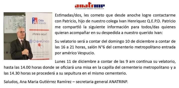 a región de Los Ríos y su capital regional se encuentran de luto, luego de la repentina muerte del destacado dirigente sindical de Anef Los Ríos y ex funcionario del Instituto de Previsión Social, Iván Patricio Henríquez Guerrero. Quien falleció en la madrugada de este sábado en la ciudad de Valdivia.