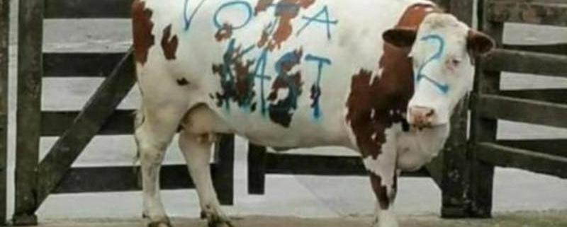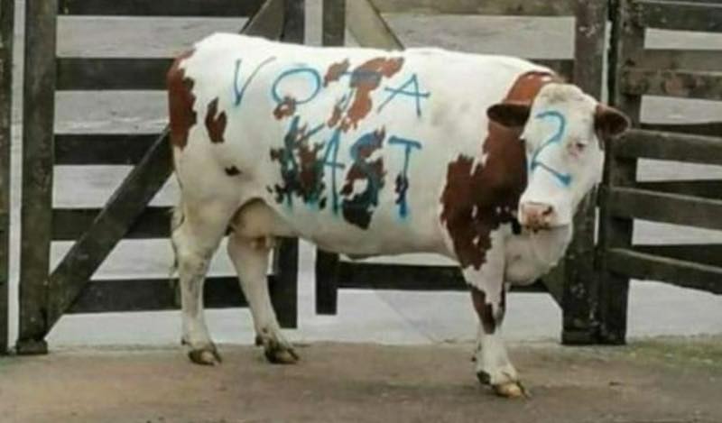 El hecho ocurrió en un remate realizado este miércoles en la Feria de Ganaderos (Fegosa) de esta ciudad. Durante el cual el ejemplar fue exhibido y también golpeado por los asistentes. Para posteriormente ser rematado. La vaca estaba rayada con un número “2” en la frente y además tenía escrito “Vota Kast”.