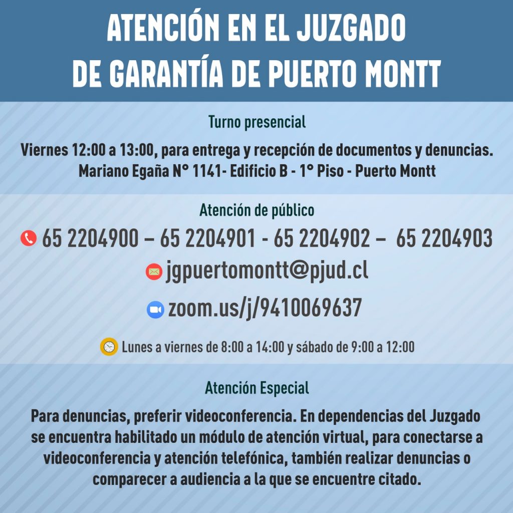 La jueza vocera del tribunal, Marcela Araya Novoa, señaló que “lo que nos interesa, como Juzgado de Garantía de Puerto Montt, es privilegiar que los usuarios, a fin de que comparezcan a las audiencias virtuales, se conecten vía plataforma Zoom, desde sus casas; que no se desplacen al tribunal y que se queden resguardados, porque ellos pueden conectarse desde sus computadores o teléfonos inteligentes, para lo cual solo deben tener acceso a internet y bajar la aplicación Zoom, que es gratuita”.