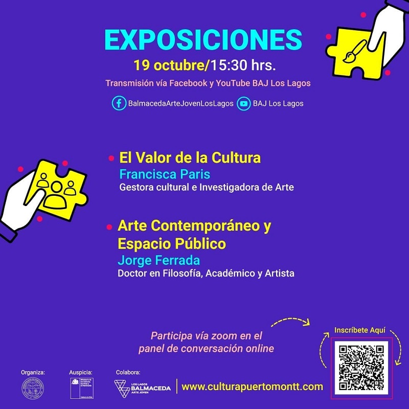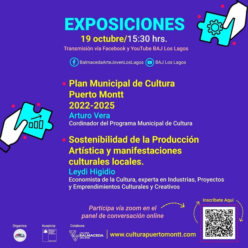 Esta iniciativa corresponde a un esfuerzo conjunto entre la Municipalidad de Puerto Montt y el Ministerio de las Culturas, las Artes y el Patrimonio. Junto a Balmaceda Arte Joven (BAJ) Los Lagos. Los artistas y actores culturales que deseen participar del panel de conversación online que se realizará via zoom pueden inscribirse aquí. Se buscará la promoción de alianzas estratégicas entre los distintos actores del ecosistema cultural de la comuna. Además de dar a conocer las iniciativas que el municipio propone a la comunidad. Con el objetivo principal de profesionalizar y validar al sector artístico cultural de la capital regional.