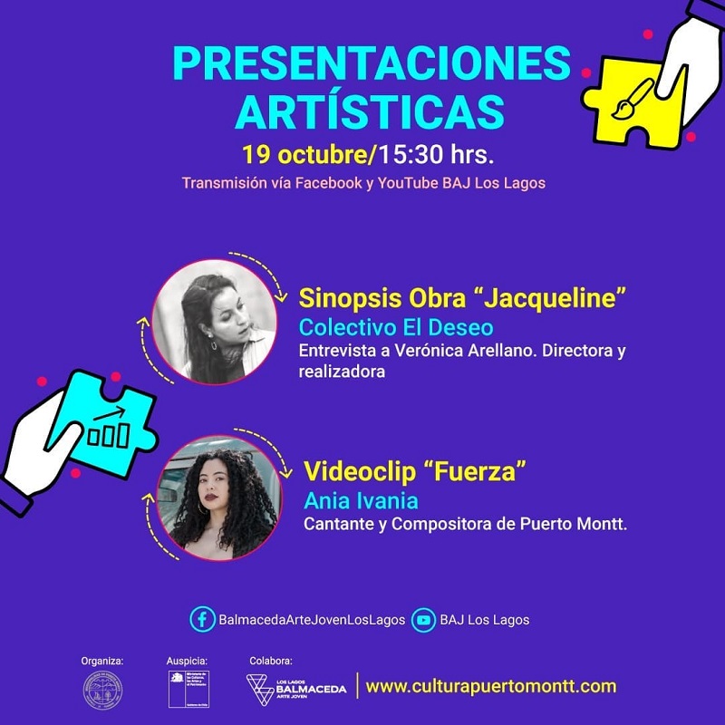 Además, se podrán visualizar una serie de presentaciones artísticas y exposiciones a través de RRSS de BAJ Los Lagos. Tales como la presentación de la Obra “Jacqueline” del Colectivo El Deseo. Que incluye una entrevista con Verónica Arellano, directora y realizadora. Y el visionado del Videoclip “FUERZA” de Ania Ivania, cantante y compositora. Todas las actividades se transmitirán a través del Facebook y Youtube de BAJ Los Lagos.