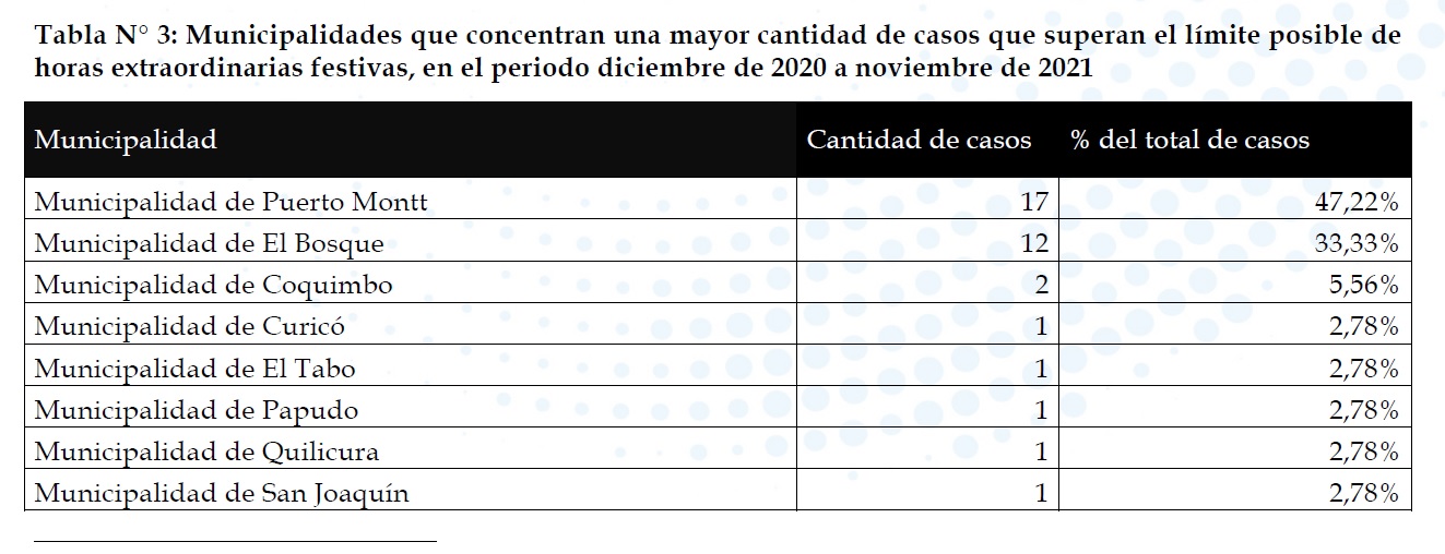 El Consejo Para la Transparencia (CPLT) realizó un informe de horas extraordinarias municipales, abarcando el periodo entre diciembre de 2021 y noviembre de 2021. Gracias a ello, pudieron identificar pagos sobre los 51 millones de pesos, repartidos en el 84% de los municipios del país que fueron parte del proceso. Sobre lo mismo, se evidenciaron casos en los que se superan las horas extra diurnas señaladas por la norma.
