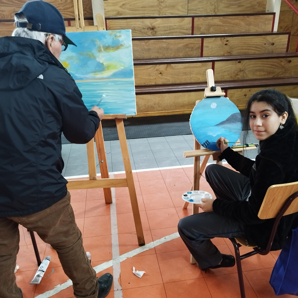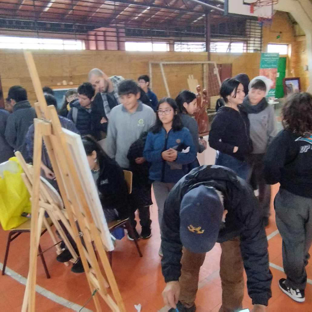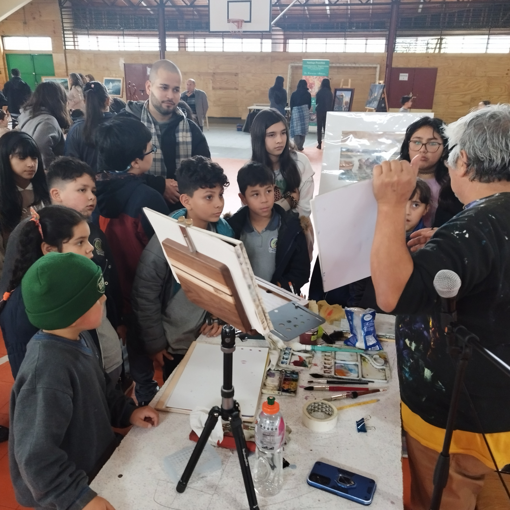 El encuentro permitió a estudiantes de cuarto a octavo básico disfrutar de un recorrido cultural. Los artistas visuales y escultores instalaron en el gimnasio de la escuela diversas obras creadas por ellos y llevaron a cabo un ejercicio de mediación, estimulando el pensamiento crítico y motivando la creatividad. Además, las niñas y niños pintaron acuarelas en cuadernillos especialmente habilitados, guiados por los artistas.