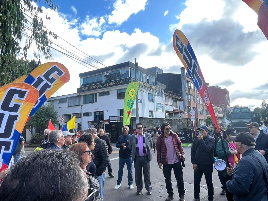 La Unión Nacional de Trabajadores del Estado y Servicios Públicos de Colombia (UTRADEC), afiliada a la CLATE, junto a otras organizaciones y centrales sindicales, se movilizó ayer frente a la Embajada de los Estados Unidos en la ciudad de Bogotá para rechazar la injerencia de ese país en la Región y exigir el respeto por la soberanía de los pueblos.