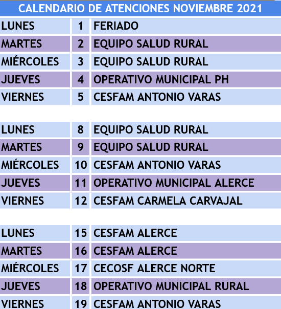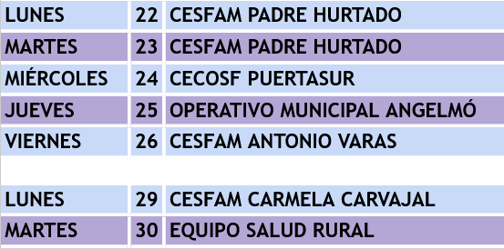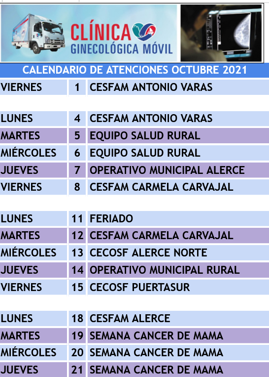 Desde la Municipalidad de Puerto Montt recordaron la existencia de las Clínica mamográficas móviles. Cuyo calendario para octubre y noviembre de 2021 puedes revisar en las siguientes imágenes: