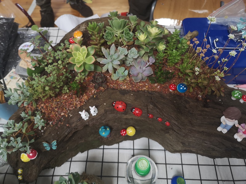 Ahí todo cambio, y empezaron a hacer arreglos más grandes, trabajando con madera. Y también un nuevo enfoque de reciclaje, sobre todo con las botellas de plástico, creando maceteros envueltos en arpillera para reutilizarlas. También reutilizan los troncos que encontraban ya derribados en el bosque. Realizando maceteros con esa madera. Además de reutilizar otros desechos como las bandejas de plumavit o plástico de ciertos alimentos para criaderos de suculentas. Lindos arreglos, una gran variedad de maceteros pintados a mano, y una gran variedad de suculentas, comunes y raras son parte de la propuesta de” Rangipun Jardín”. Pedro cuenta que “tratamos siempre de ir innovando, aumentando la producción y teniendo cosas bonitas para la gente”.