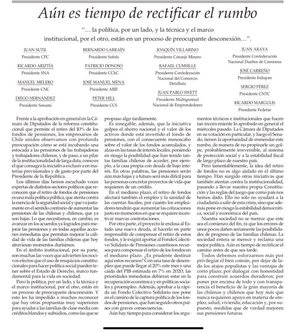 Bajo el título “Aún es tiempo de rectificar el rumbo”, los principales gremios empresariales y productivos del país publicaron una carta en el diario El Mercurio. En el documento muestran su oposición a que los chilenos puedan hacer uso del 10 por ciento de sus ahorros en las AFP. Lo anterior, para hacer frente a la crisis provocada por la pandemia del Covid-19.