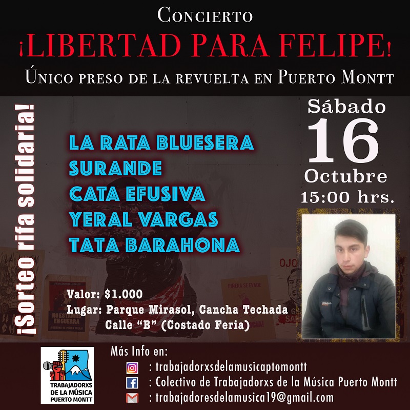 Este sábado a las 15 hrs. en en el Parque Mirasol de Puerto Montt se realizará el sorteo de una rifa y un concierto solidario. Con la consigna de la liberación de Felipe Santana. La actividad es convocada por el Colectivo de Trabajadores de la Música de Puerto Montt. Y la Red de Apoyo de Felipe Santana.