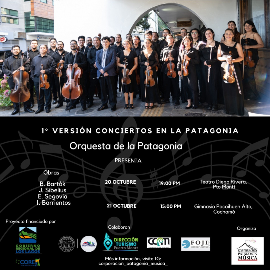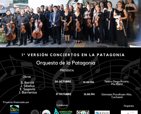 Gracias al financiamiento del Fondo de Actividades Culturales Regionales (7% F.N.D.R) Gobierno Regional Los Lagos se inaugura la temporada de Conciertos en la Patagonia. / La Orquesta de la Patagonia realizará un concierto especial para la comunidad rural de Pocoihuen el sábado 21 de octubre, 15:00 horas, Gimnasio Pocoihuen Alto, Cochamó. Entrada liberada.