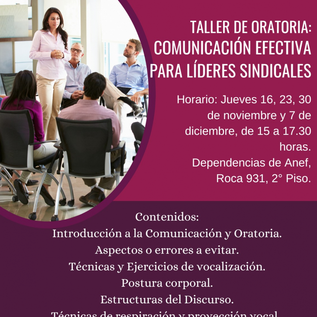 ajo la finalidad de mejorar las habilidades comunicativas, dominar técnicas de voz y lenguaje y mejorar la confianza entre otras. Es que el Consejo regional de Anef Magallanes organizó una capacitación a las y los líderes sindicales denominado “Taller de Oratoria: Comunicación Efectiva para Líderes Sindicales” dictado por la profesional Carolina Ruiz, que busca potenciar las características propias del arte de la oratoria y potenciar en conocimiento y herramientas a los presidentes y directores de las diferentes asociaciones que participan de la multigremial en la región austral.
