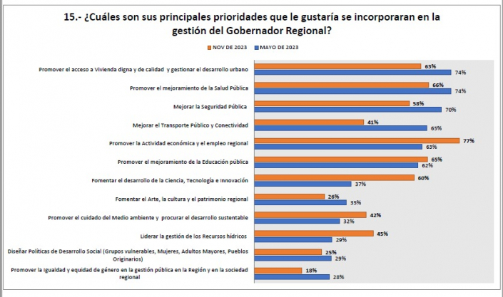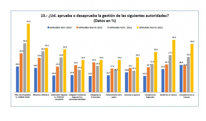 Asimismo la evaluación del desempeño de las principales autoridades regionales sigue cayendo. El gobernador regional de Los Lagos, Patricio Vallespín, su aprobación cae del 19,2% al 12,5%. Por su parte la Delegada Presidencial de Los Lagos cae del 20,2% al 12,9%. Adicionalmente se puede agregar que la aprobación a los parlamentarios de la región refleja esta misma tendencia cayendo desde 17,6% al 12,7%.