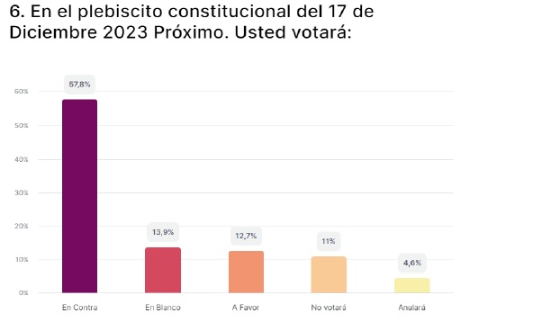 Otra pregunta sobre el proceso constitucional expuesta a los encuestados fue En el caso que la actual propuesta constitucional sea aprobada en el plebiscito del próximo 17 de diciembre, ¿usted cree qué?. Sobre dicha interrogante un 48% indicó que la nueva Constitución no resolverá los problemas del país; un 33,3% dijo no sentirse involucrado; un 11% expresó que sí tendremos una Constitución que nos represente y un 7,7% no sabe o no contesta.