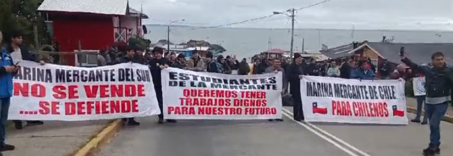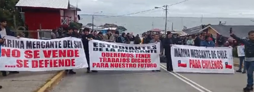 ajo movilización y protestas en diferentes puntos de la capital regional, Castro y otras localidades y otra regiones del país, los trabajadores marítimos se han manifestado en contra de la Ley de Cabotaje que aprobó la Cámara de Diputados y que pasará a una comisión en el Senado.